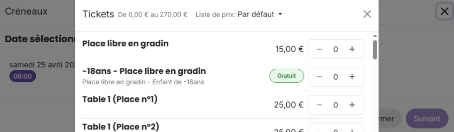 Si vous devez réserver des places à tarif réduit et des places à tarif plein, il faudra obligatoirement passer 1 commande par liste de prix.