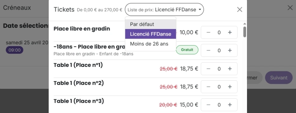 Après avoir sélectionné le jour de votre venue, dans la liste des tickets disponibles, il faudra sélectionner la liste de prix "Licencié FFDanse" pour voir apparaitre les prix à tarif réduit.